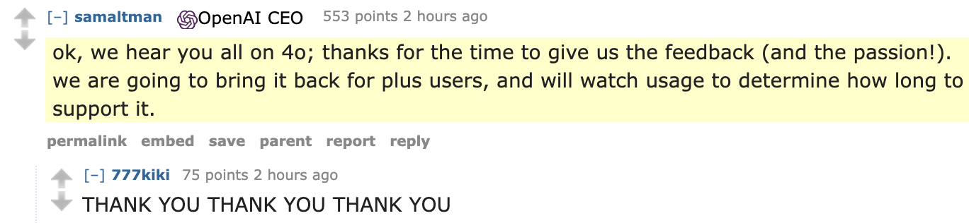 If you think this sounds dramatic, look at this Hacker News thread and the Reddit AMA with Sam Altman. Overnight, people's workflows and relationships with the model were disrupted.
